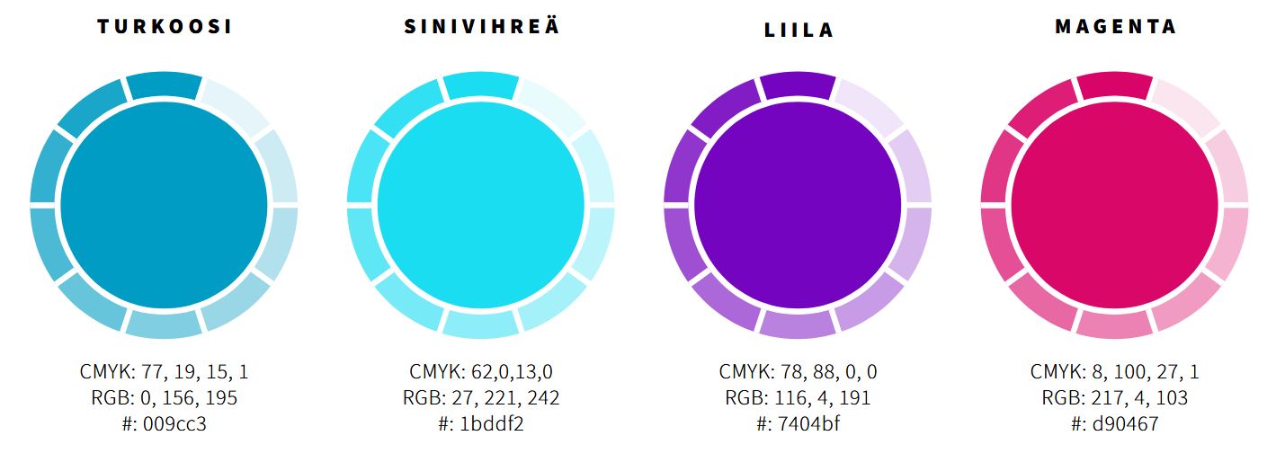 Rainmakerin brändivärit ovat turkoosi, sinivihreä, magenta, liila. Turkoosi on pääväri ja se tulee olla pääosassa materiaaleissa. Sinivihreää, liilaa ja liilaa käytetään harkiten korostusvärinä. Alta voit katsoa väriarvot.